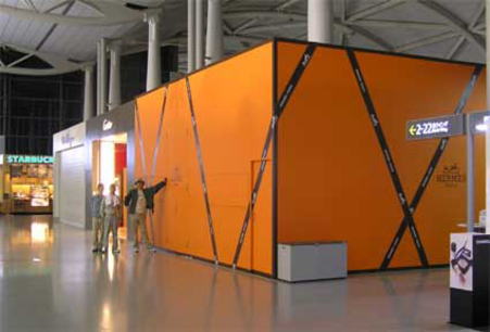 関西空港、北エルメスの仮設間仕切工事です軽鉄間仕切下地を65のスタットで組み、PB12.5oを貼って、塗装(オレンジ2回塗り)、エルメス専用のテ−プを貼られました、仮設工事でここまできれいにされるのは、初めての経験でびっくりしました!たくさんの空港内の客様・スチュワ−デスの方たちが、仮設間仕切をバックに記念写真を撮っておられました!(仮設間仕切の単価)●この仮設間仕切は455ピッチで組みました